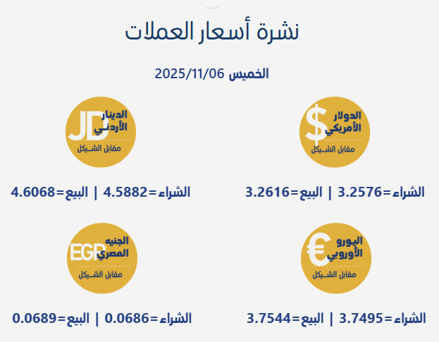 رام الله 6-11-2025 وفا- جاءت أسعار صرف العملات مقابل الشيقل الإسرائيلي، اليوم الخميس، بحسب سلطة النقد الفلسطينية، على النحو التالي: