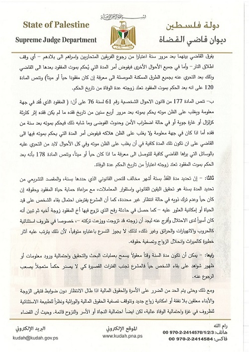 رام الله 9-12-2025 وفا- أصدر المكتب الفني في المحكمة العليا الشرعية–ديوان قاضي القضاة، اليوم الثلاثاء، تعميمًا رسميًا يوضح فيه الموقف القانوني من "التعميم القضائي" الذي تم تداوله في قطاع غزة بشأن إثبات وفاة المفقود بعد ستة أشهر فقط من وقف إطلاق النار.