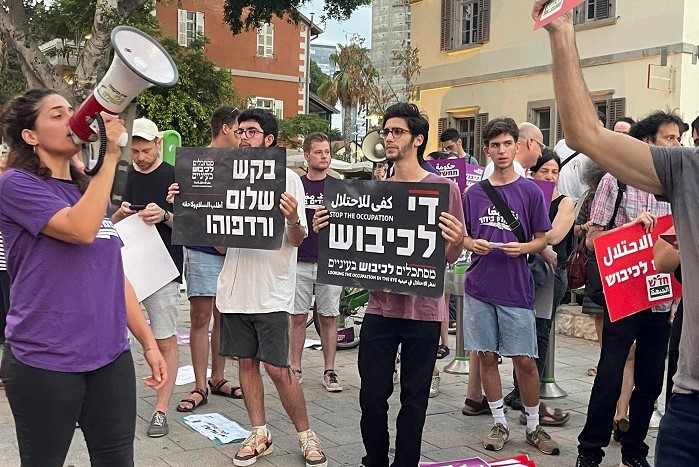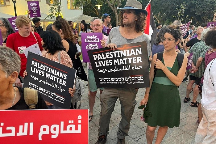 تل أبيب 6-8-2022 وفا- تظاهر العشرات من "النشطاء ضد الاحتلال"، الليلة، في تل ابيب، تنديدًا بالعدوان على قطاع غزة.
