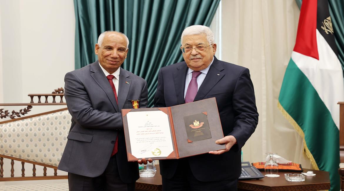 رام الله 1-10-2022 وفا- قلّد رئيس دولة فلسطين محمود عباس، المناضل الوطني الدكتور محمد خميس عياش، ميدالية الإنجاز من وسام الرئيس محمود عباس.