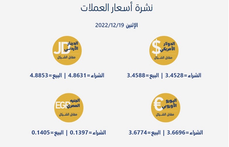 رام الله 19-12-2022 وفا- جاءت أسعار العملات مقابل الشيقل الإسرائيلي، اليوم الاثنين، حسب سلطة النقد، على النحو التالي: