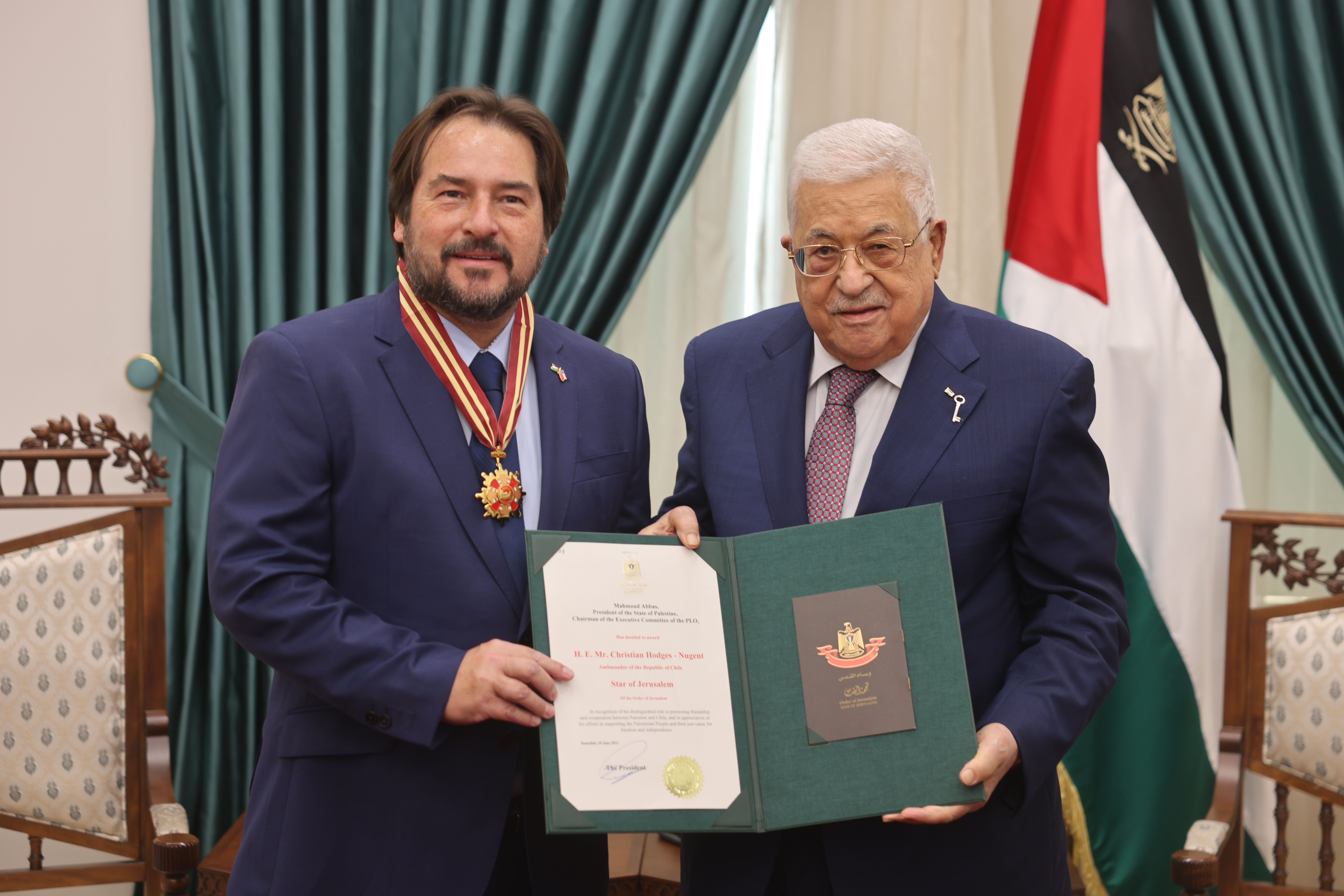 ومنح الرئيس عباس، ممثل التشيلي وسام نجمة القدس، تقديرا لدوره المتميز في تعزيز علاقات الصداقة والتعاون بين فلسطين وتشيلي، وتثمينا لجهوده في دعم الشعب الفلسطيني، ونصرة قضيته العادلة، من أجل نيل حريته واستقلاله.