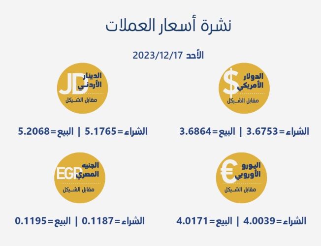 رام الله 17-12-2023 وفا- جاءت أسعار صرف العملات مقابل الشيقل الإسرائيلي، اليوم الأحد، بحسب سلطة النقد الفلسطينية، على النحو التالي: