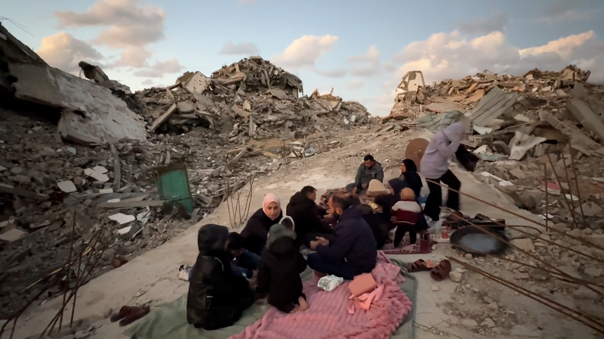 أسرة تتناول إفطار رمضان فوق منزلها المدمر بغزة