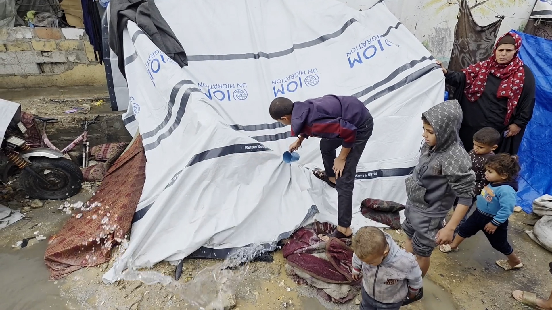 خيام النازحين تتهاوى أمام السيول الناتجة عن الأمطار الغزيرة في دير البلح وسط قطاع غزة