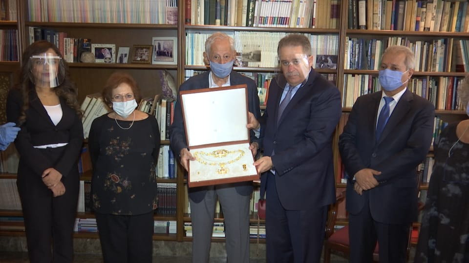 بيروت 23-9-2020 وفا- نيابة عن رئيس دولة فلسطين محمود عباس، سلم سفير دولة فلسطين لدى الجمهورية اللبنانية أشرف دبور، اليوم الأربعاء، عائلة العالم الفلسطيني الراحل انطوان زحلان قلادة الكنعانيين الكبرى من وسام الرئيس محمود عباس.