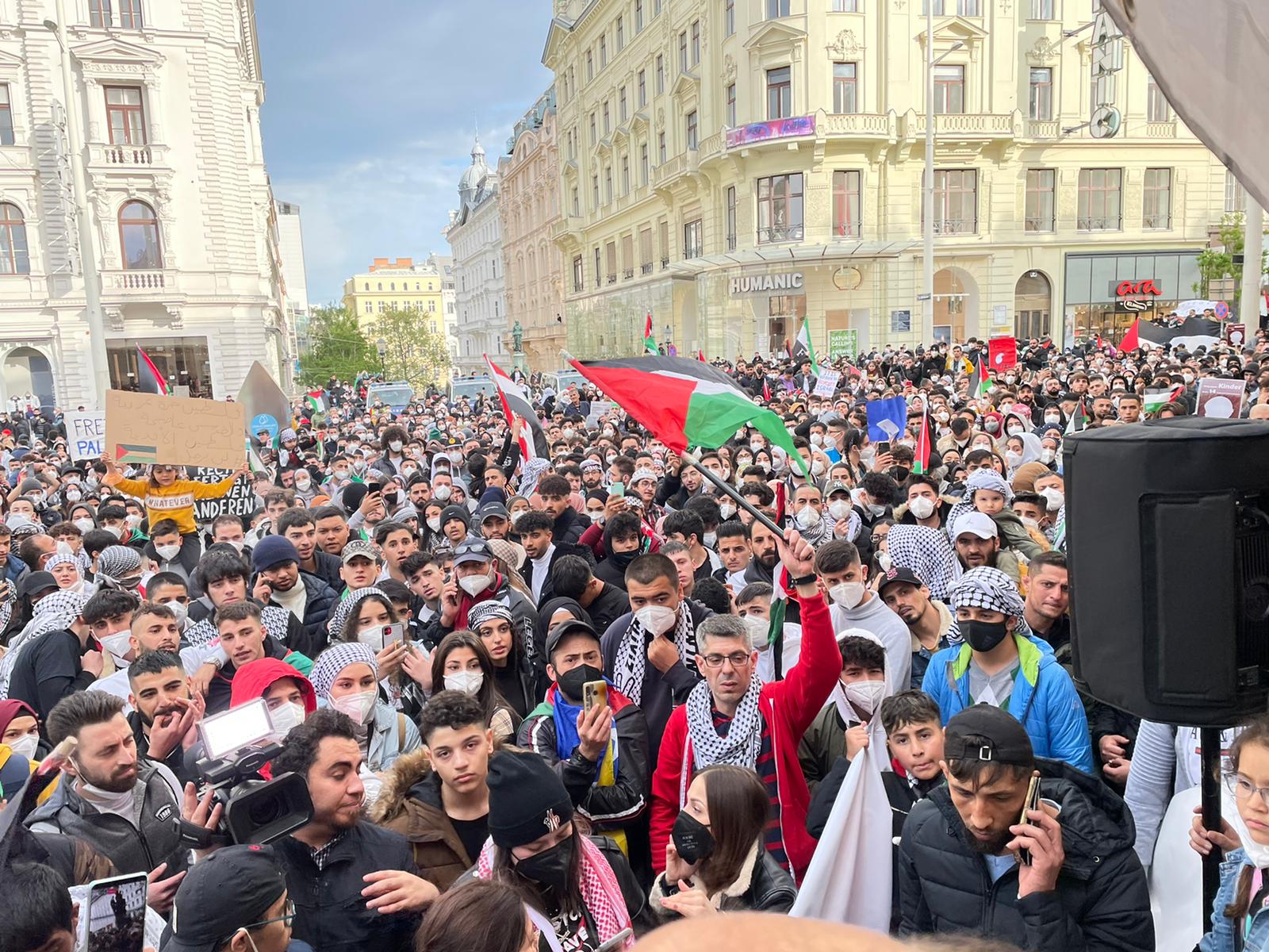 فينا 12-5-2021 وفا- شارك المئات من أبناء جاليتنا الفلسطينية في النمسا، والجاليات العربية والإسلامية، ومتضامنون نمساويون في وقفة دعم وتضامن مع أهالي حي الشيخ جراح في القدس المحتلة.
