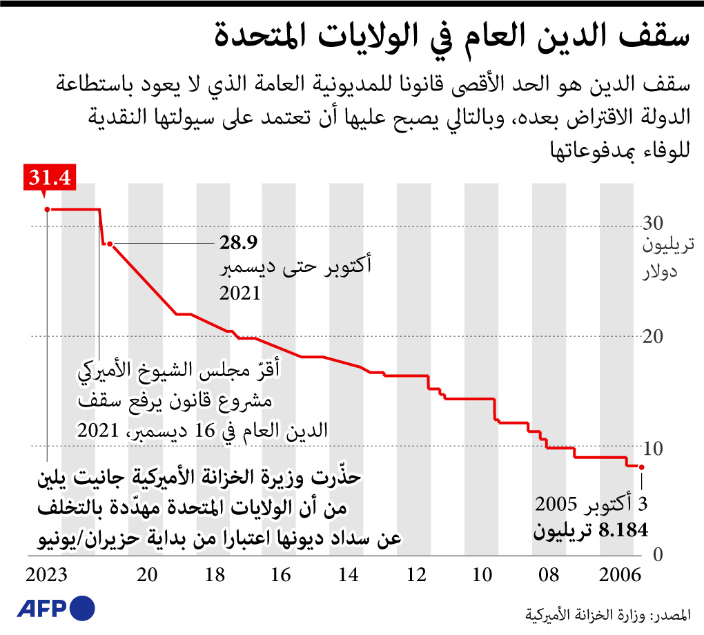 وتحذّر الإدارة من أنّ عدم رفع سقف الدين العام سيؤدّي إلى تخلّف الولايات المتحدة عن سداد مستحقّات دينها البالغة قيمته 31,4 تريليون دولار، في سابقة تاريخية من شأنها أن تُحدث صدمة في الولايات المتّحدة والعالم على حدّ سواء.