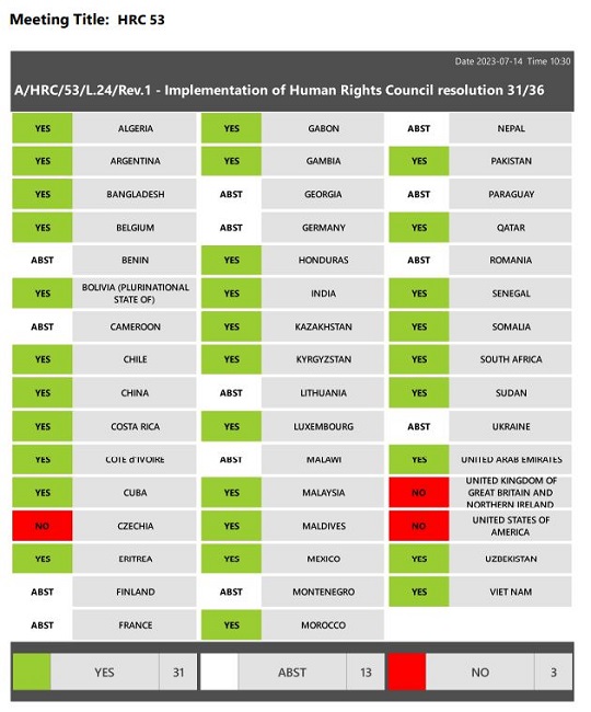 وأضافت "الخارجية" أن اعتماد هذا القرار المهم اليوم، جاء بتصويت أغلبية الدول، حيث صوتت 31 دولة لصالحه، وامتنعت 13 دولة عن التصويت، فيما انعزلت الولايات المتحدة، والمملكة المتحدة، والتشيك، بموقفها السلبي.