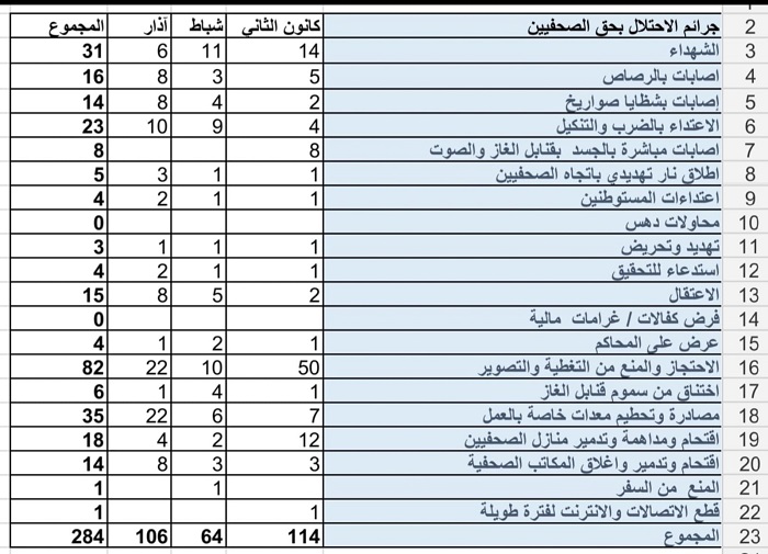 وأكد اللحام وفق الوقائع بتقرير النقابة أن العام الماضي شهد إصابة 23 صحفيا بشظايا الصواريخ ومعظمهم في قطاع غزة بينما أصيب 48 بالرصاص معظمهم بالضفة الغربية في حين قتل 102 من الصحفيين في قطاع غزة، أي أن عدد الشهداء الصحفيين ضعف عدد الصحفيين المصابين.