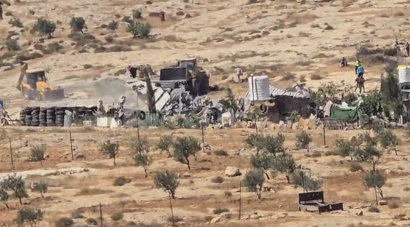 الخليل 8-7-2024 وفا- هدمت قوات الاحتلال الإسرائيلي، اليوم الإثنين، ثلاثة منازل، وحظائر أغنام، وجرفت أراضٍ ووحدات صحية وخزانات مياه، واقتلعت اشجارا، في مسافر يطا جنوب الخليل.