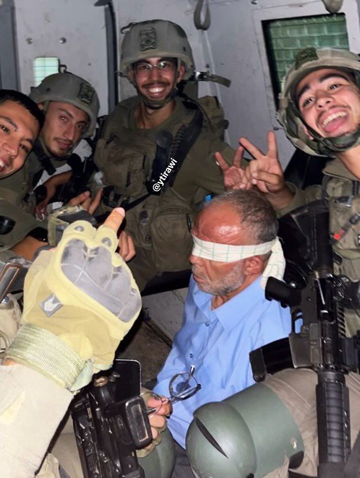 وأظهرت الصور التي نشرها أحد الجنود الذين شاركوا في عملية اعتقال المسن محمود عصافرة (60 عاما)، من بلدة بيت كاحل مطلع الشهر الماضي، وهو يجلس وسط مجموعة من الجنود وقد كبلت يداه وعصبت عيناه، وهم ينكلون ويستهزئون به، ويشيرون بأيديهم بحركات نابية.