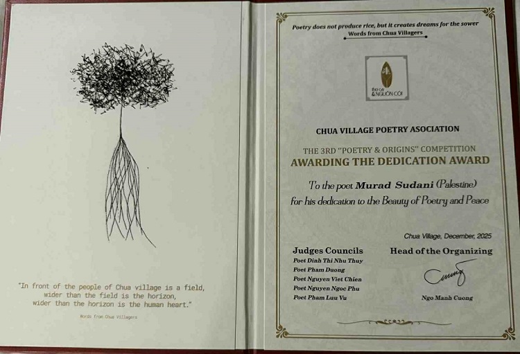 هانوي 19-12-2025 وفا- كرم رئيس رابطة كتاب فيتنام وجمعية شعراء قرية المعبد الشاعر نغوين كوانغ ثيو، الأمين العام للاتحاد العام للكتاب والأدباء الفلسطينيين الشاعر مراد السوداني، ضمن مسابقة قرية المعبد "الشعر والجذور "في نسخته الثالثة، في متحف هانوي بحضور لافت من السفراء والدبلوماسيين والشعراء والكتاب والإعلاميين.