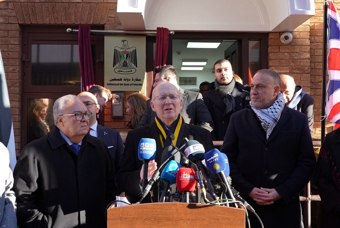 لندن 5-1-2026 وفا- افتتح سفير دولة فلسطين لدى المملكة المتحدة، حسام زملط، اليوم الإثنين سفارة دولة فلسطين لدى المملكة، وذلك بإزاحة الستار عن اللوحة الرسمية للسفارة في لندن، وذلك عقب اعتراف المملكة المتحدة بدولة فلسطين في أيلول/ سبتمبر الماضي، واستكمال الترتيبات الرسمية والبروتوكولية اللازمة بين الدولتين.
