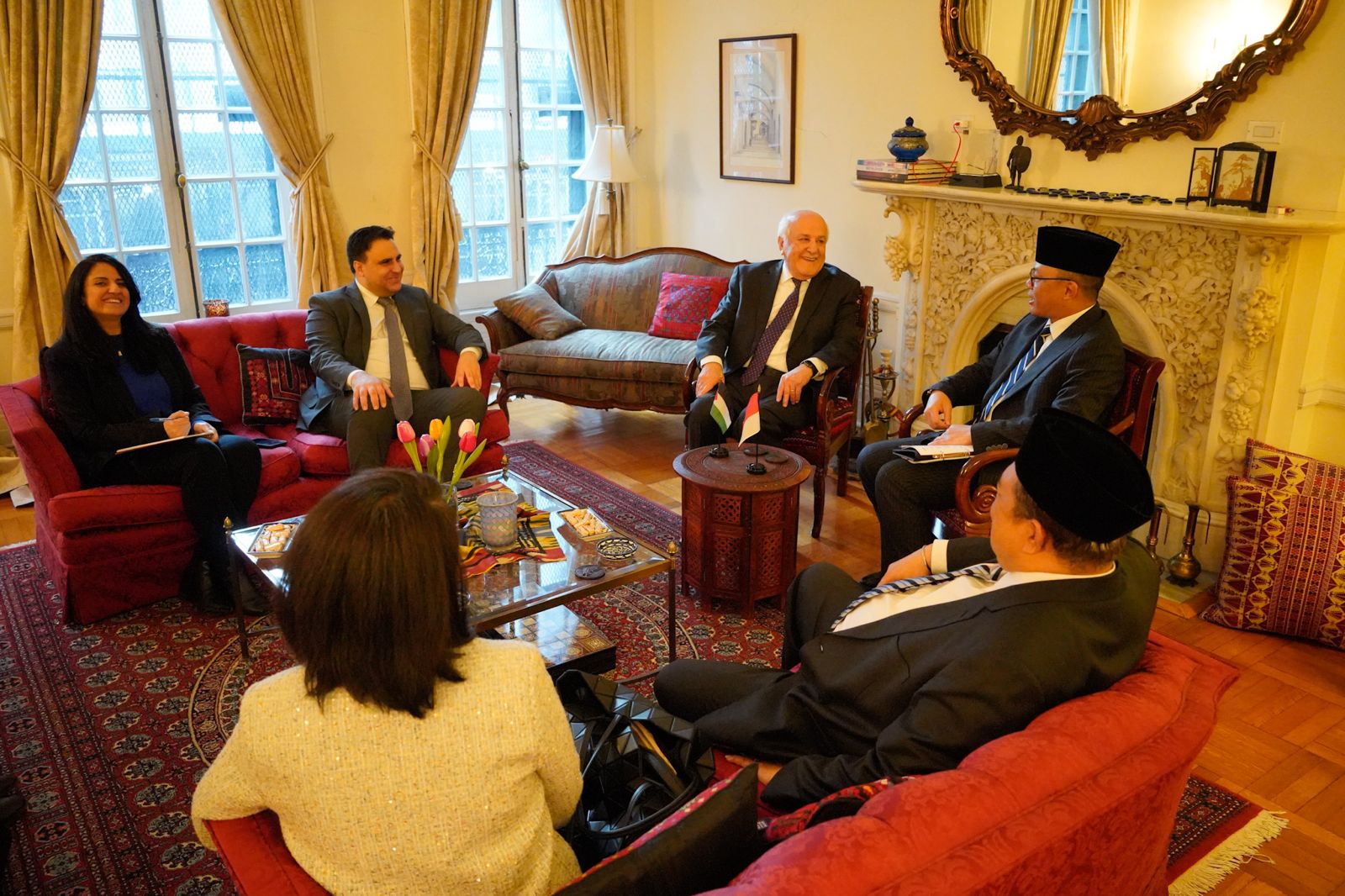 نيويورك 17-2-2026 وفا- استقبل المندوب الدائم لدولة فلسطين لدى الأمم المتحدة، الوزير رياض منصور، مساء الاثنين، في مقر البعثة في نيويورك، وزير خارجية إندونيسيا، السيد سورجيونو.