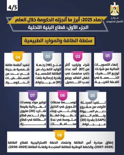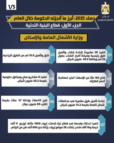 رام الله 5-2-2026 وفا- استعرض مركز الاتصال الحكومي في تقرير أصدره، اليوم الخميس، أبرز إنجازات الحكومة من مشاريع في قطاع البنية التحتية خلال عام 2025، ركزت على الحفاظ على استمرارية الخدمات الأساسية وتعزيز موثوقيتها، على الرغم من الظروف الاقتصادية والمالية الصعبة، والمتمثلة في استمرار احتجاز الاحتلال لأموال المقاصة إلى جانب الاعتداءات اليومية.