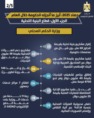 كما أقرت 146 مشروعًا تطويريًا ونفذتها، وافتتحت 7 مراكز خدمات الجمهور، وأسهمت في دعم التشغيل عبر إطلاق برنامج التعافي المجتمعي بقيمة 40 مليون دولار الذي وفّر نحو 6700 فرصة عمل من خلال البلديات. وفي مجال البنية التحتية، أقرت الوزارة مشاريع بقيمة تتجاوز 68 مليون شيقل من مخصصات حكومية (بند أمانات النقل على الطرق)، إضافة إلى 25 مليون دولار بتمويل من الصناديق العربية بإدارة البنك الإسلامي للتنمية، وبدأت بتنفيذ مشروع الإدارة المتكاملة للنفايات الصلبة بقيمة 25 مليون دولار، إلى جانب ربط 11 خدمة من خدماتها على منصة الدفع الإلكتروني E-SADAD، بما يعزز كفاءة الخدمات والتحول الرقمي.