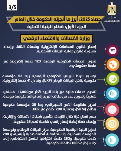 شهد العام الماضي إصدار قانون المعاملات الإلكترونية وخدمات الثقة، وإعداد مسودة قانون حماية البيانات الشخصية، وتفعيل هيئة تنظيم قطاع الاتصالات. كما جرى تطوير الخدمات الحكومية الرقمية عبر منصة "حكومتي" التي وفرت (123) خدمة إلكترونية، مع تسجيل (33,464) مواطنًا وتفعيل (1,984) مستخدمًا خلال العام.
