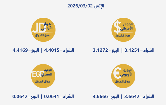 رام الله 2-3-2026 وفا- جاءت أسعار صرف العملات مقابل الشيقل الإسرائيلي، اليوم الإثنين، بحسب سلطة النقد الفلسطينية، على النحو التالي: